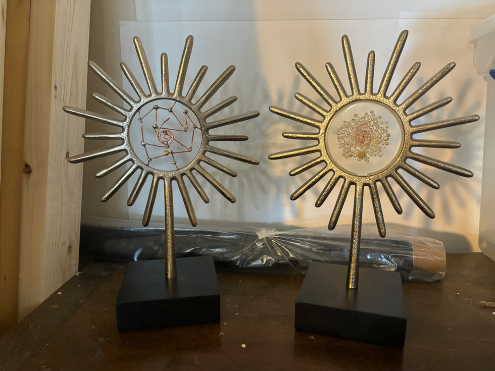 Custom Sun Plaques with precious metals in different assortment and variation in the middle of each sigil. The properties of the metals when struck with sunlight can cause the metals to release vibrational frequencies said to raise the mood of individuals near the metals. Metals used in this project includes Silver, Gold, and Copper.